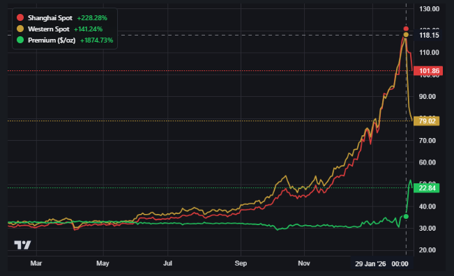 After the 30% silver price smash on the CME COMEX late on Friday January 30, 2026, the Shanghai silver cash price now trades at a +29% or +$22.98 premium to the price in Western markets.