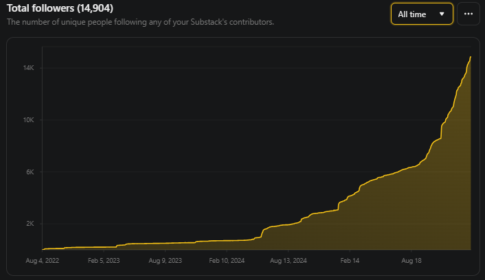 There are now 11,336 e-mails subscribers and a total of 14,904 e-mail subscribers + Substack followers.