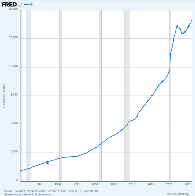 Figure 1 - M2 Money Stock (Total System Currency) 1980 - 2026; source: St. Louis Fed
