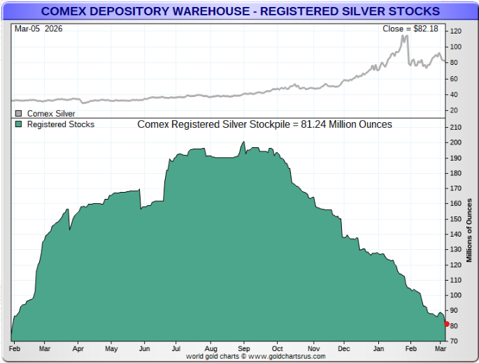 Our March 4, 2026 update on the rapidly declining silver exchange inventories globally, noted that ‘Registered’ vault inventories (i.e. inventory available to market) in CME COMEX vaults in New York had declined at a net rate of 20M oz. per month over the prior 5.5 months to stand at 87M oz.