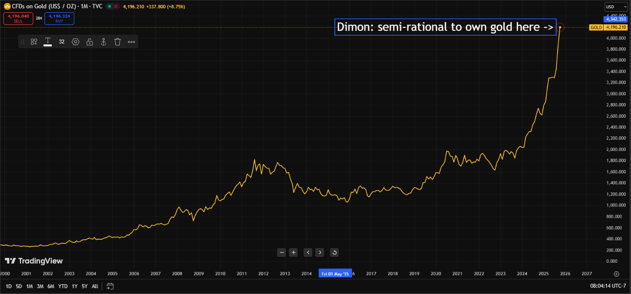 “I am not a gold buyer — the cost of holding it is 4%. But in an environment like the current one, its price could easily rise to $5,000 or $10,000. This is one of the few times in my life when I feel that holding some gold in an investment portfolio is ‘semi-reasonable.’ ”