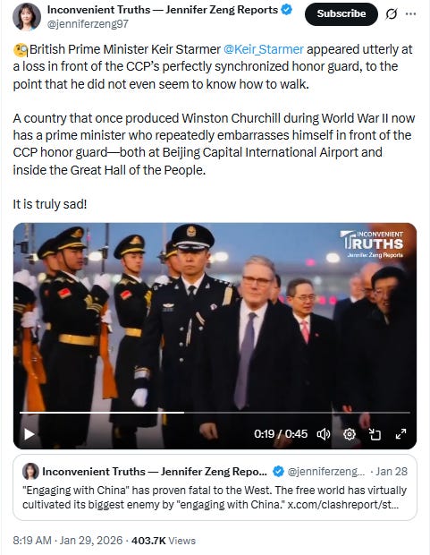 I will leave you with this video of the UK’s PM Keir Starmer arriving in China last Thursday January 29 - slouched shoulders and looking bewildered. Perhaps there are problems in, say, The City of London’s markets.