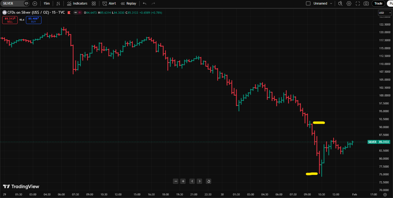 Figure 1 - Cash/Spot Silver Price January 29 to 30, 2026 - 15 Minute Intervals; source: TradingView.com